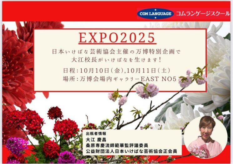 COMランゲージスクール校長 大江昌恵(大江慶昌)が日本を代表する華道家の一人として、いけばな芸術の集大成を晴れやかに展観いたします。後期展:10月10日(金)~11日(土)NO5の出瓶となります。花の力、いのちの輝きをこめたいけばな芸術の神髄を、こころゆくまでご鑑賞いただきたくご案内申し上げます。