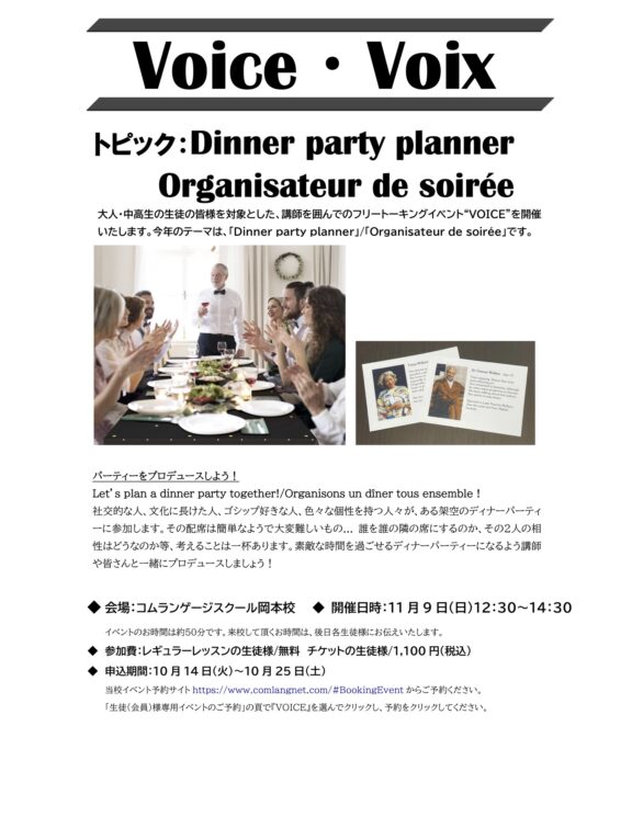 大人・中高生の生徒の皆様を対象とした、講師を囲んでのフリートーキングイベント“VOICE”を開催いたします。今年のテーマは、「Dinner party planner」/「Organisateur de soirée」です。