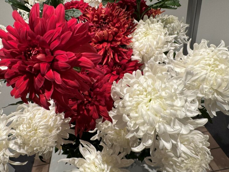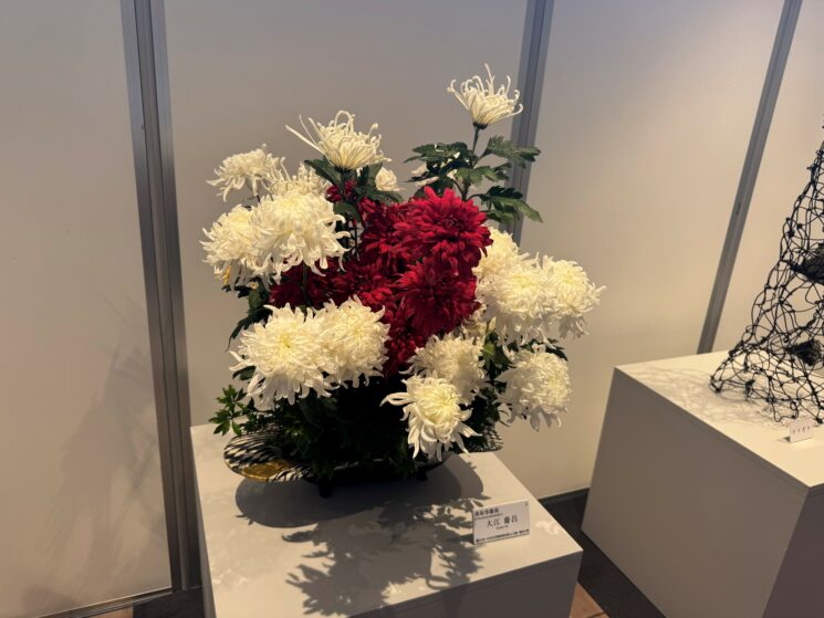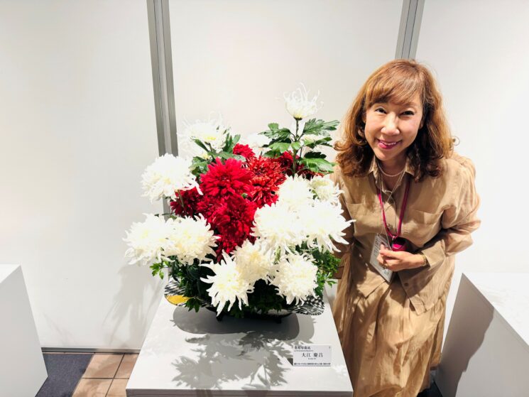 テーマは「日本」 花材「紅白の菊」 花器「竹内眞三郎先生の金彩の作品