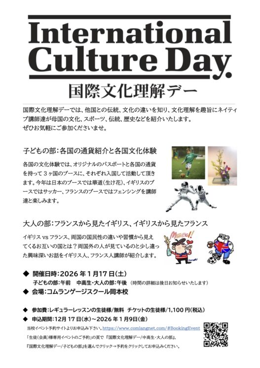 2026年1月17日(土)に開催いたします。国際文化理解デーでは、他国との伝統、文化の違いを知り、文化理解を趣旨にネイティブ講師達が母国の文化、スポーツ、伝統、歴史などで紹介いたします。ぜひお気軽にご参加くださいませ。
